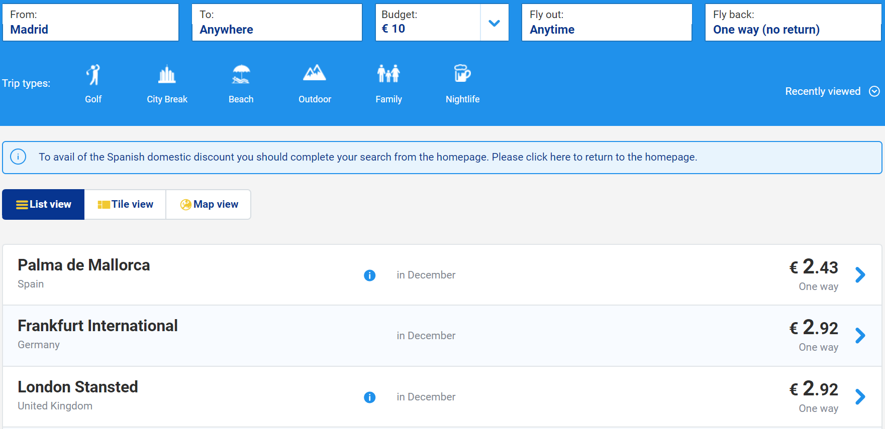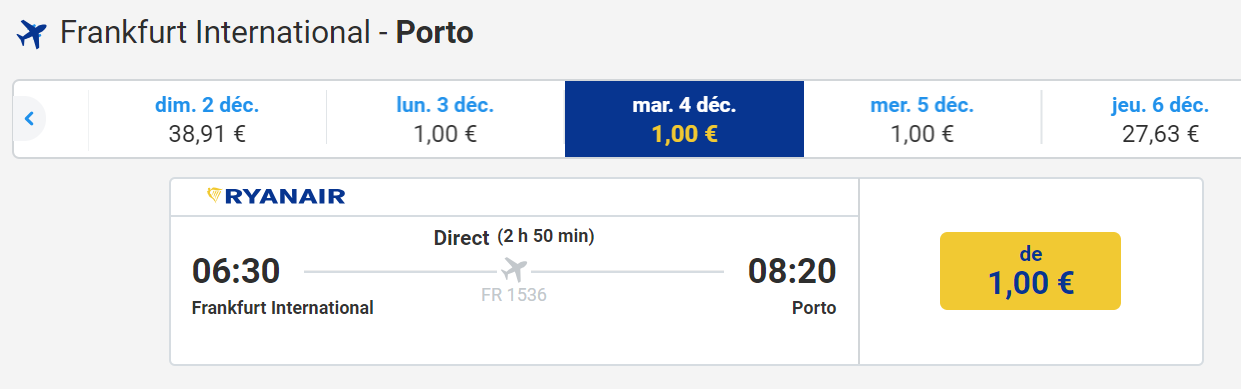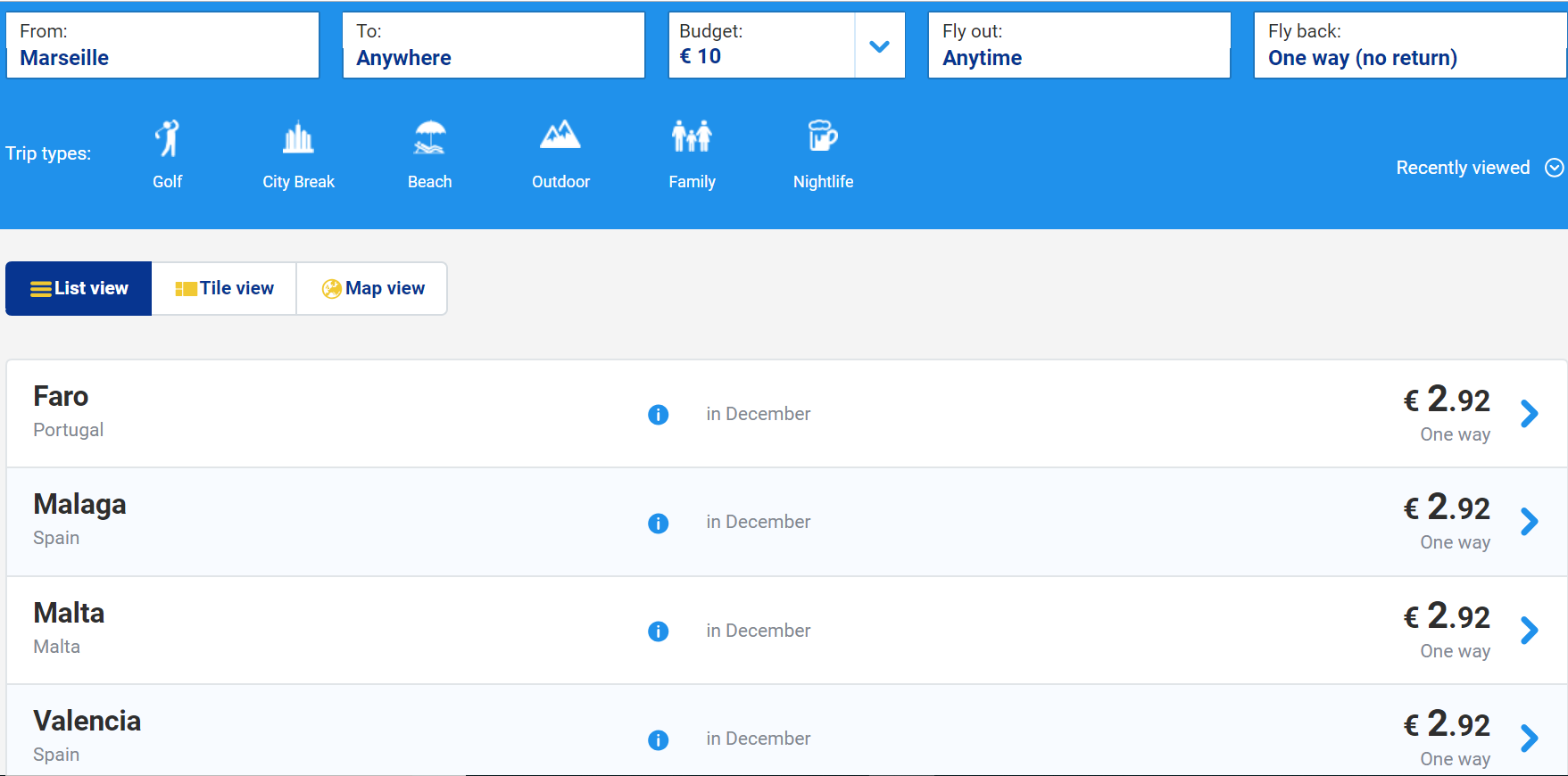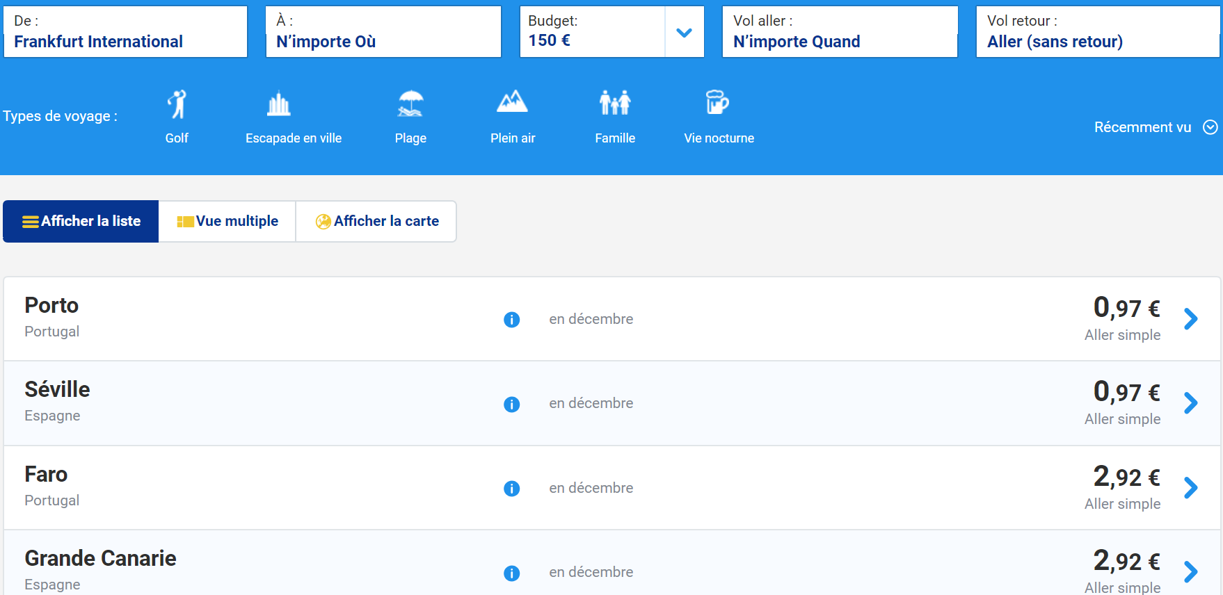 sur le site de Ryanair et entrez la ville de départ au choix puis vous allez
